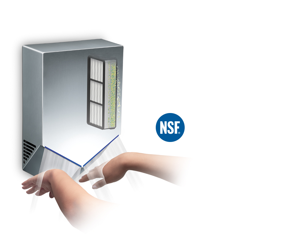 El secador de manos Dyson Airblade V tiene dos filtros HEPA a cada lado de la máquina. Cada filtro captura un 99,95% de las partculas del tamaño de las bacterias tan pequeños como 0,1 micras presente en el aire del baño.